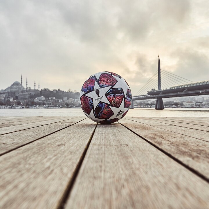 Based on the same template as the regular 19-20 CL ball, the Final ball features a bold graphic in pink and blue, showing the an aerial view of Istanbul and the Bosporus strait.