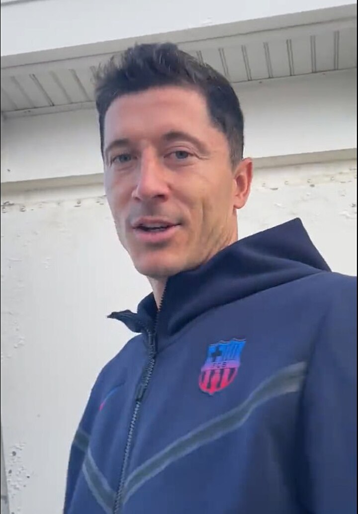 In a video released on the club's social media channels on Tuesday evening, Lewandowski can be seen walking up to a camera in Barcelona's latest strip before looking at his badge and uttering the words 'Hi, Cules'.