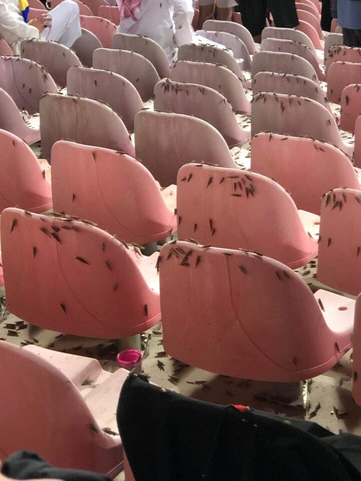 According to reports, an almost biblical swarm of locusts descended into the stadium midway through the match.