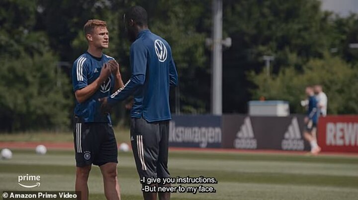 In another cut, Rudiger unceremoniously shoves Goretzka away in training, while Borussia Dortmund defender Niklas Sule warns Kimmich to: 'Stop yapping at me, I'm telling you.'