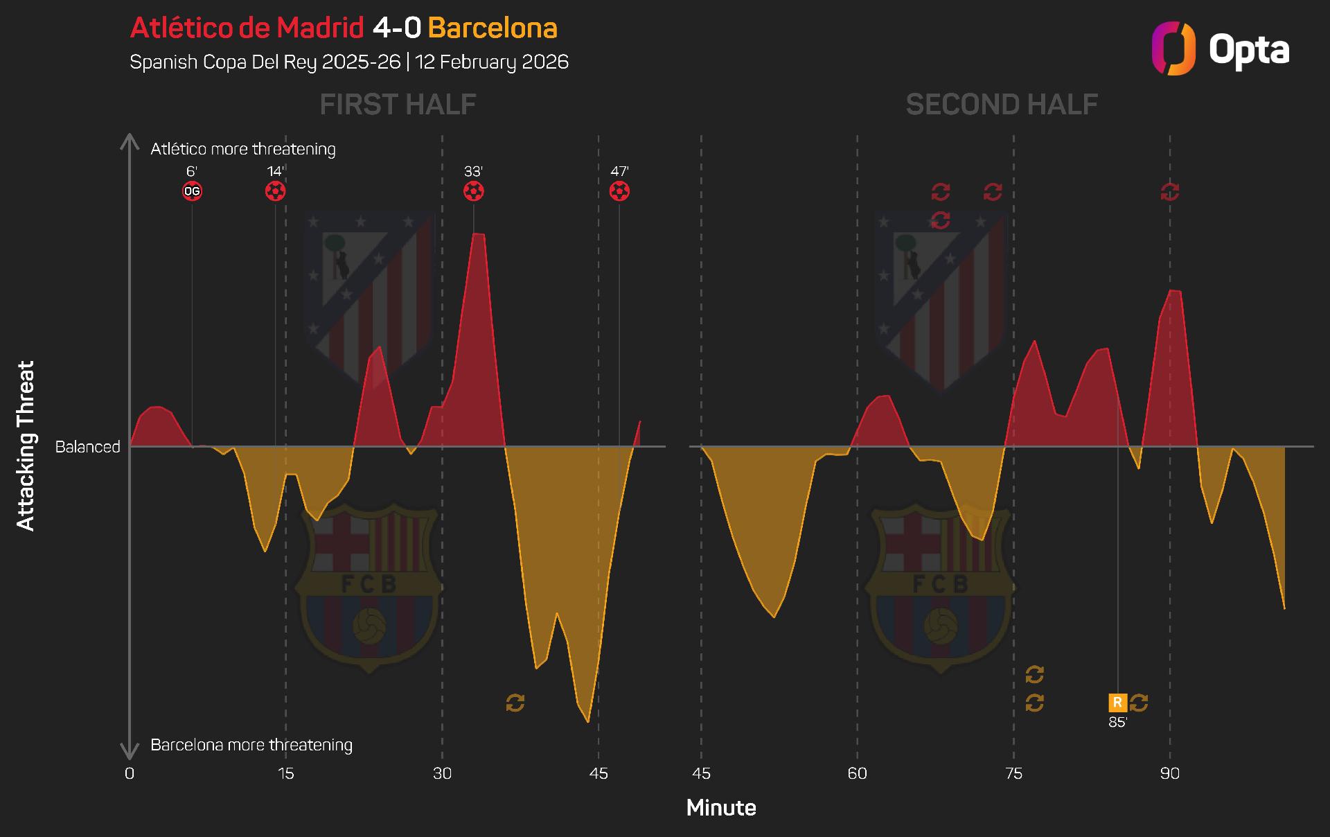 But Atletico were clinical as they played off Barcelona's high line, accumulating 2.3 expected goals (xG) from their 12 shots, eight of which were on target.