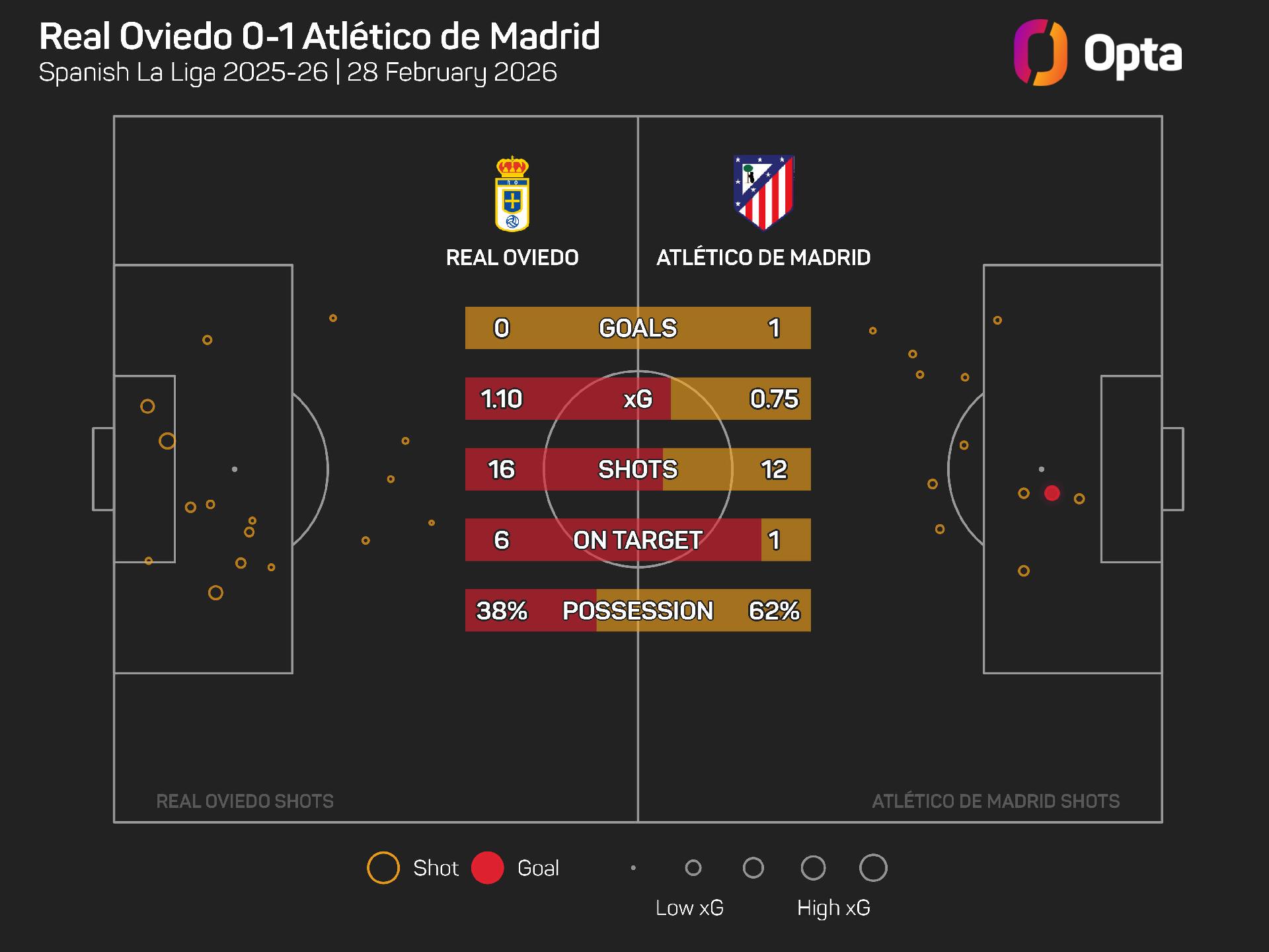 And the Rojiblancos also had Jan Oblak to thank as he made six saves to frustrate the relegation-threatened hosts, who had 16 attempts in total worth 1.1 expected goals, bettering Atleti's 0.8 xG.