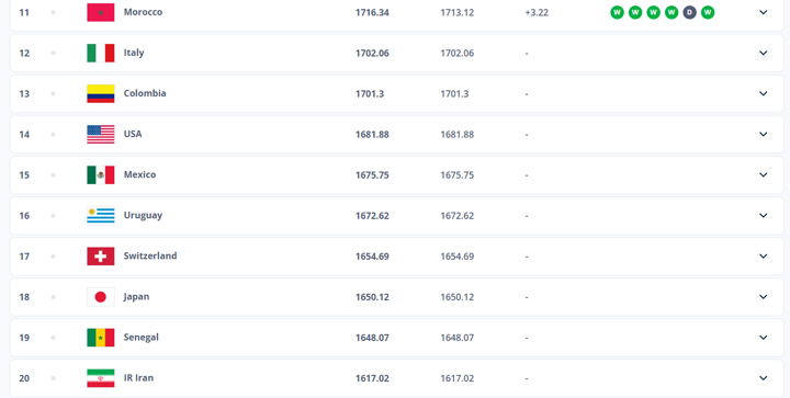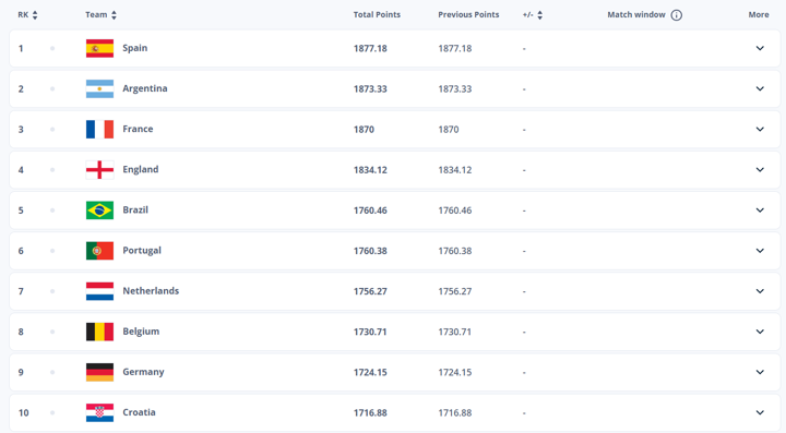 Alongside Croatia, fellow top 10 nations England (4th), Brazil (5th), Portugal (6th), the Netherlands (7th), Belgium (8th) and Germany (9th) remain unchanged.