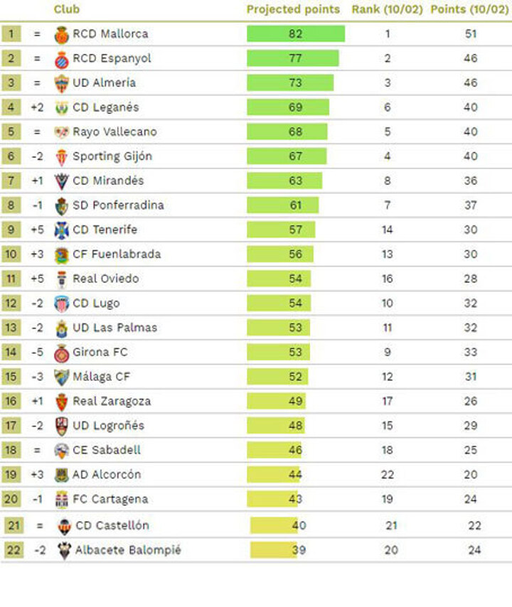 The CIES Football Observatory expect Real Mallorca and Espanyol to finish the job and secure automatic promotion. They're currently the leaders and are expected to remain so. Almeria, Leganes, Rayo Vallecano and Sporting Gijon would then battle it out in the relegation playoffs.