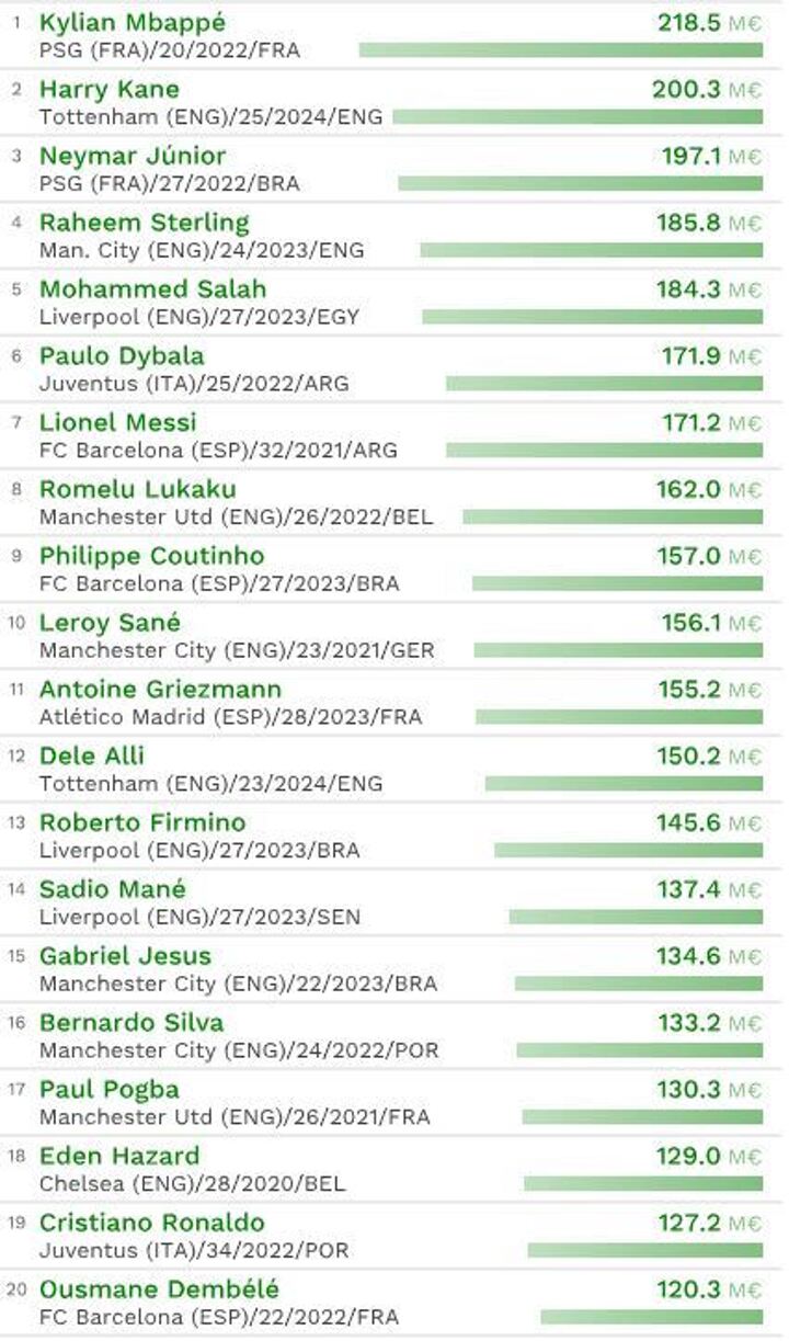 His price tag stands at 218.5 million euros, which is 18.2m euros more than Tottenham's Harry Kane in second place.