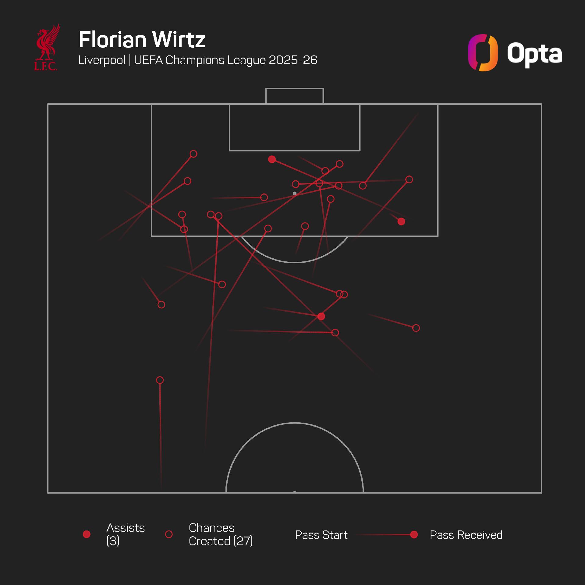 Wirtz has created 27 chances from open play in nine Champions League games for Liverpool.
