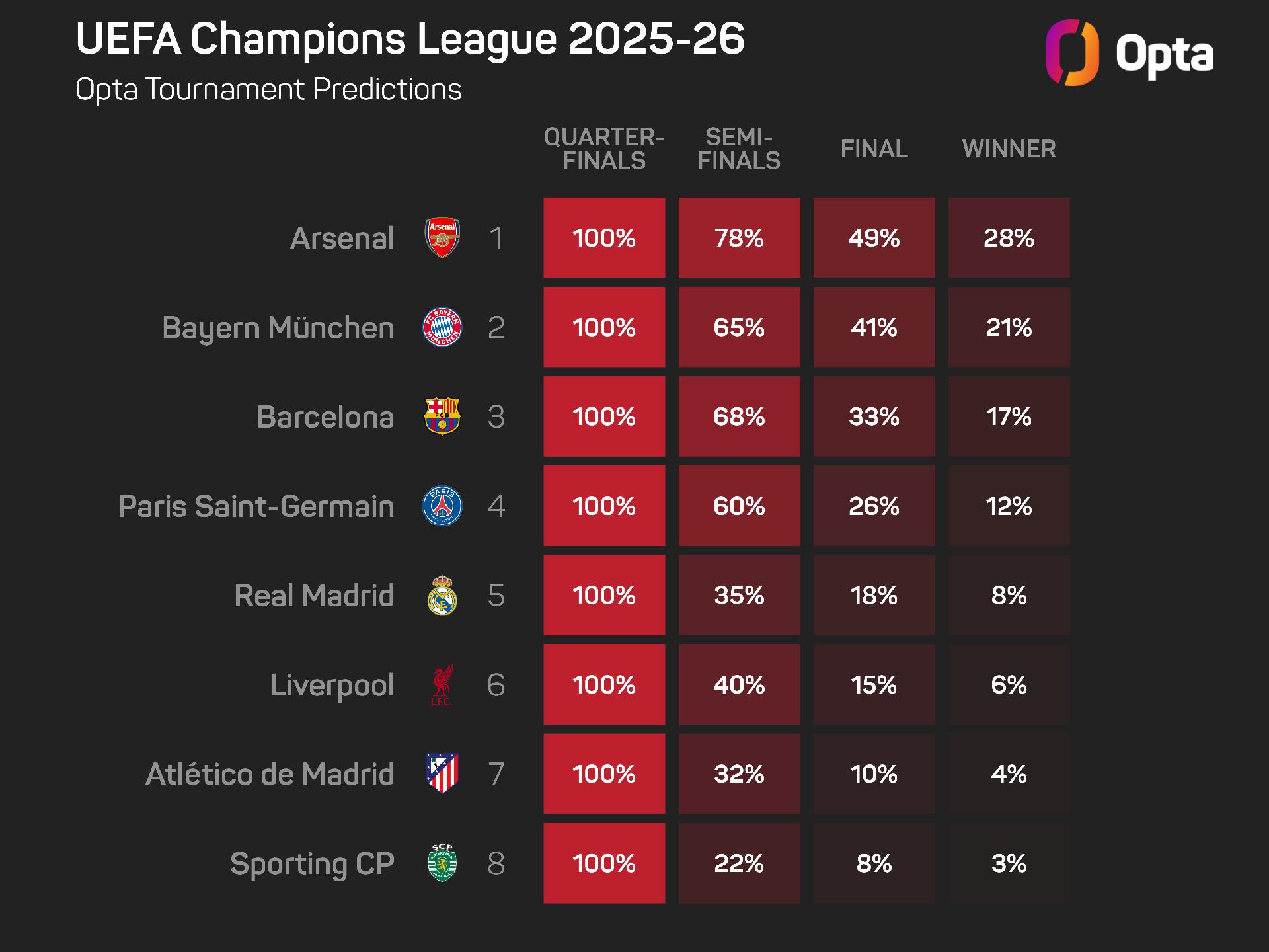 They remain among the favourites to win it, with the supercomputer giving them a 12% chance of regaining their trophy, with only Arsenal (28%), Bayern (21%) and Barcelona (17%) ahead of them.