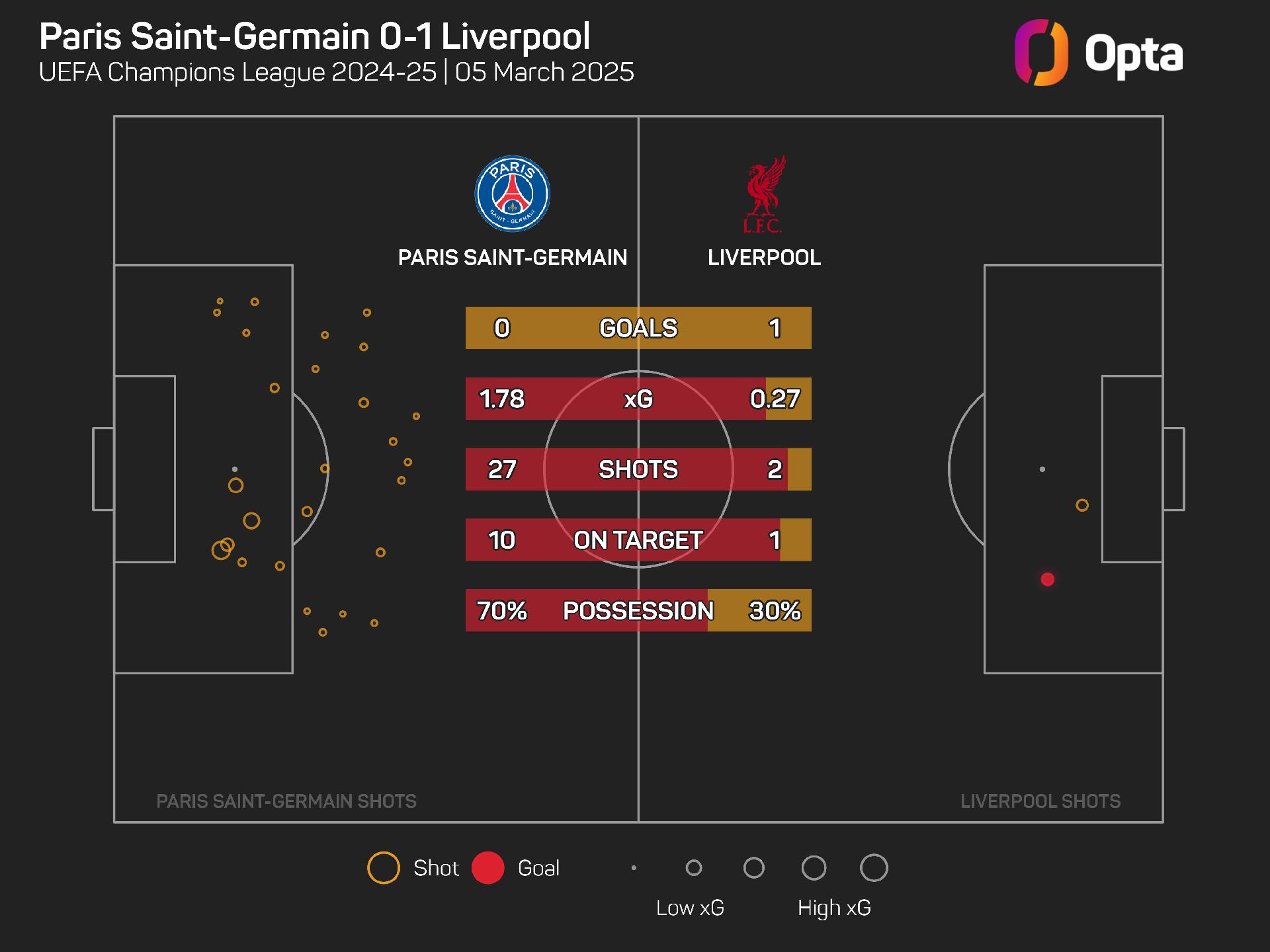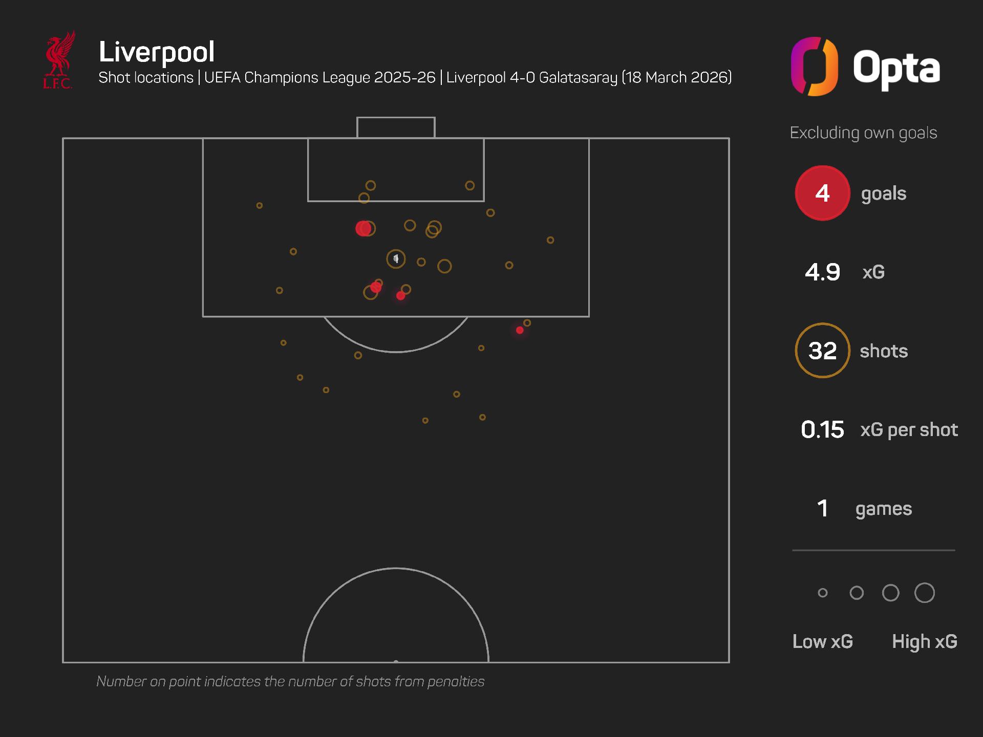 Liverpool had 32 shots in that match, racking up 4.9 xG from their 32 attempts, with 16 of those on target.