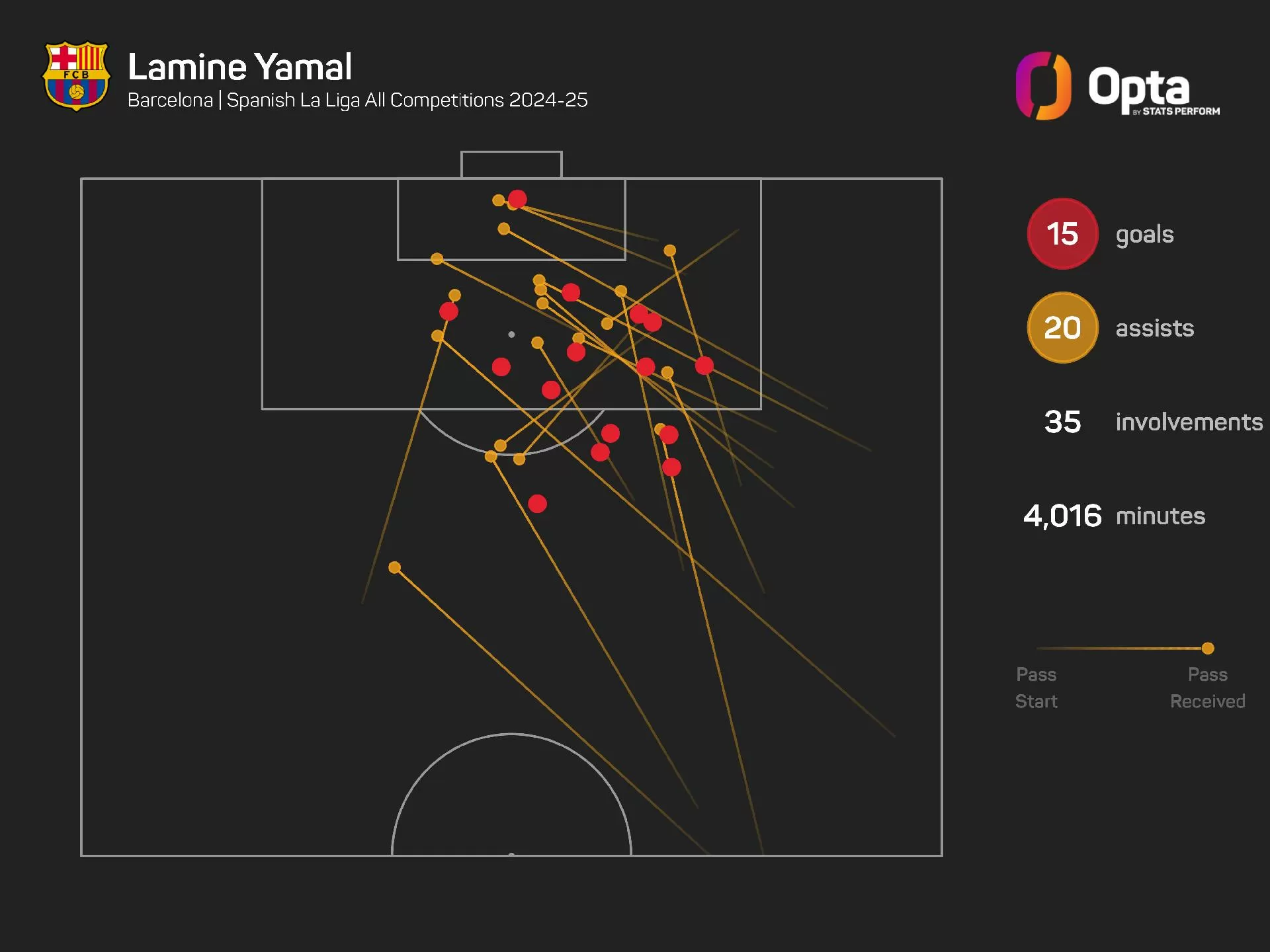 In all competitions, Yamal has netted 15 goals and registered 24 assists as he continues to aid Barcelona's push for a treble.