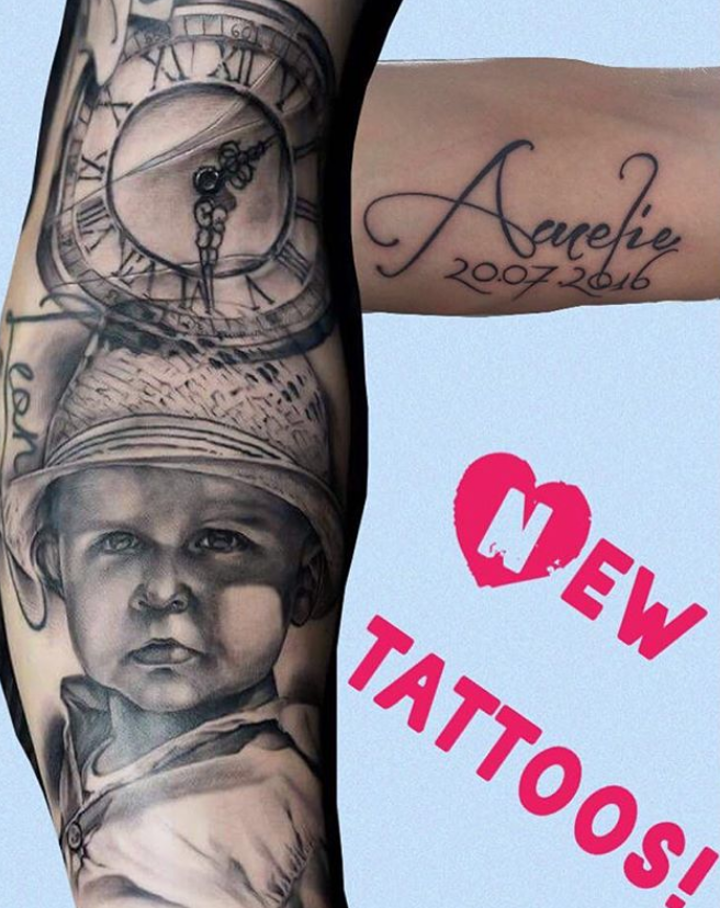 Given the tattoos that have already taken pride of place on the German's body, the arrival of a third child has people speculating about what will come from the same German tattooist that created those for Leon and Amelie.