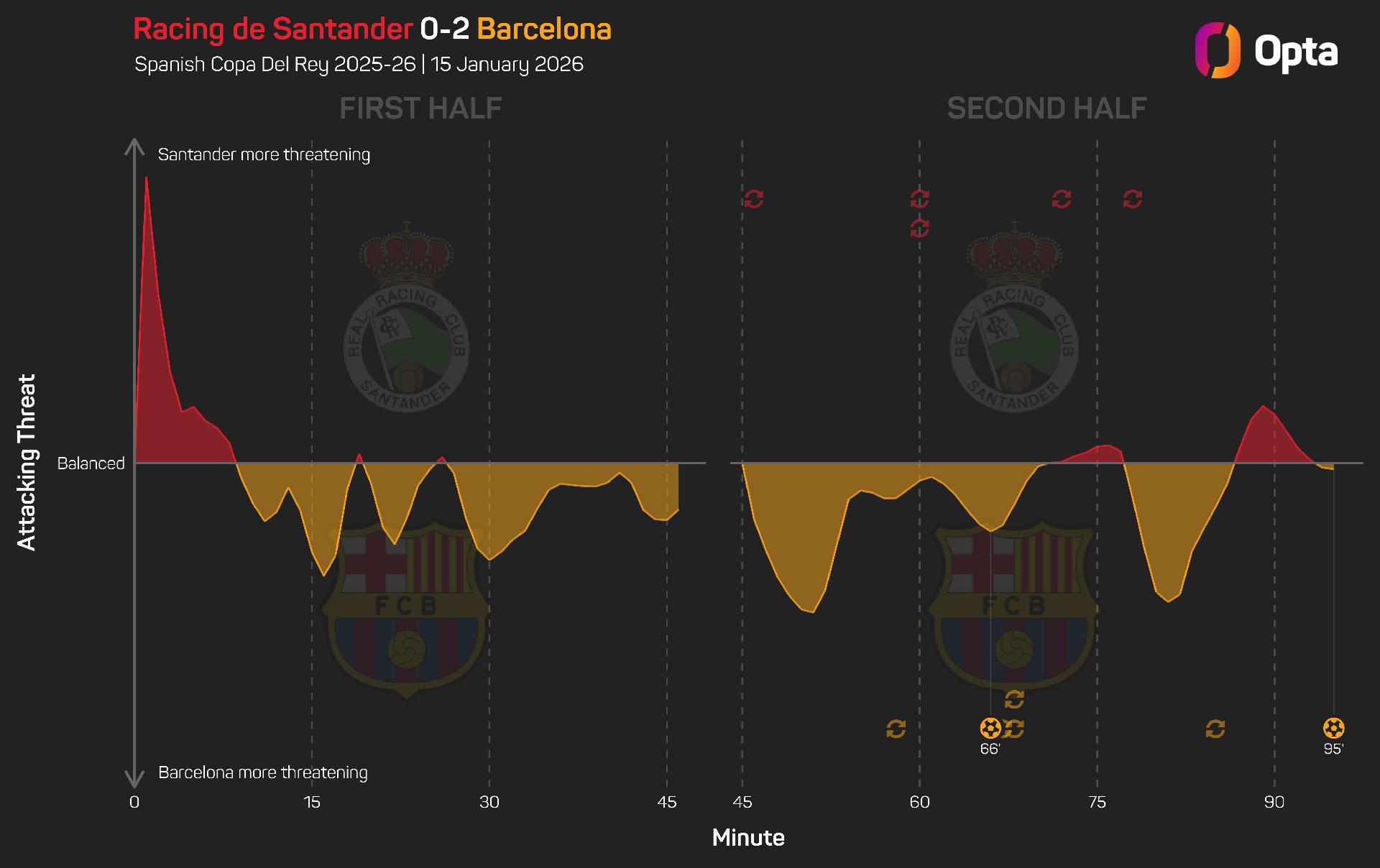 Racing only had 22.6% of the ball and attempted just six shots to Barca's 17, accumulating 0.91 expected goals (xG, Barca had 2.23).