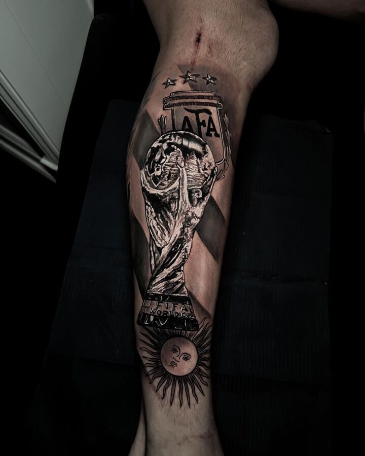 The tattoo features the World Cup trophy with Argentina's badge, flag and three stars.