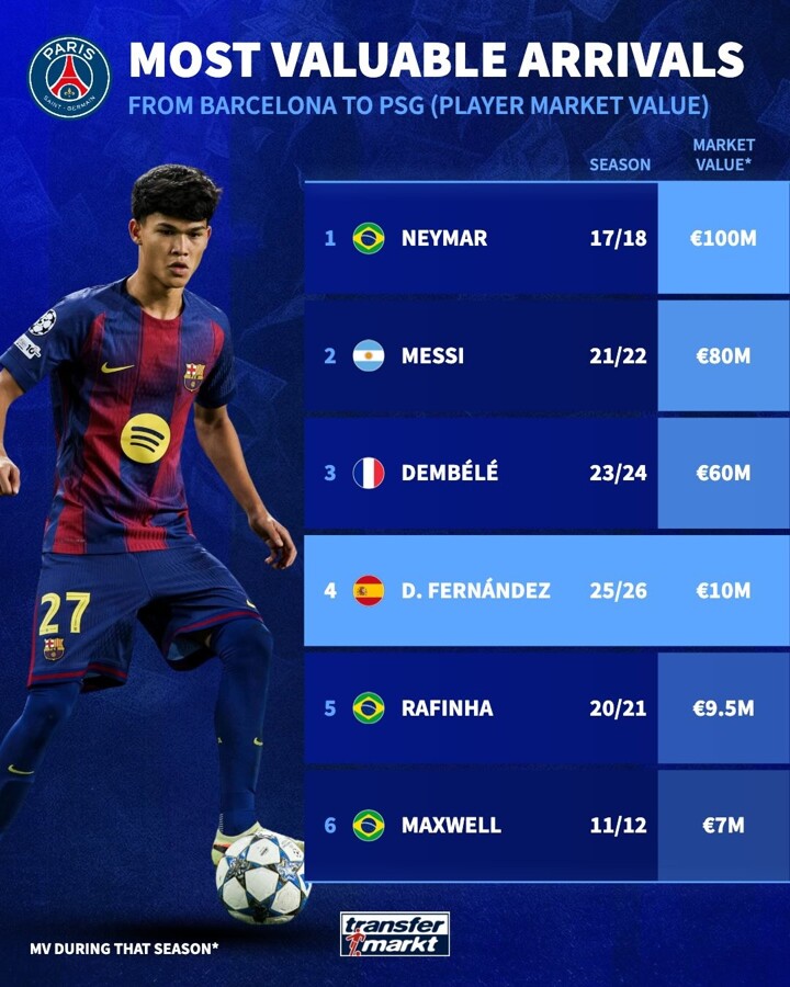 Following Dro's transfer to Paris Saint-Germain, Transfermarkt compiled a ranking of the market value of players who have moved from Barcelona to Paris Saint-Germain.