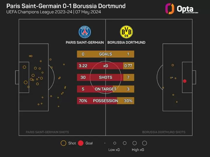 PSG amassed 3.2 expected goals. This was just the fourth Champions League game on record (since 2010-11) in which a team managed at least 3.0 xG but has failed to score.
