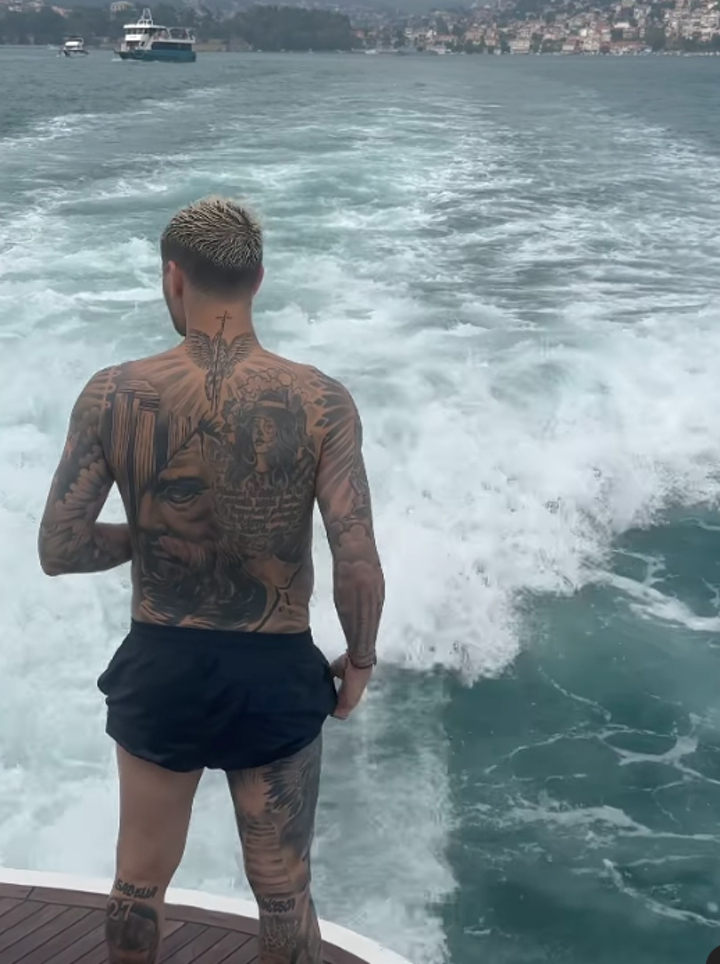 Icardi, 30 wore a small pair of swimming shorts and a white shirt aboard the superyacht.
