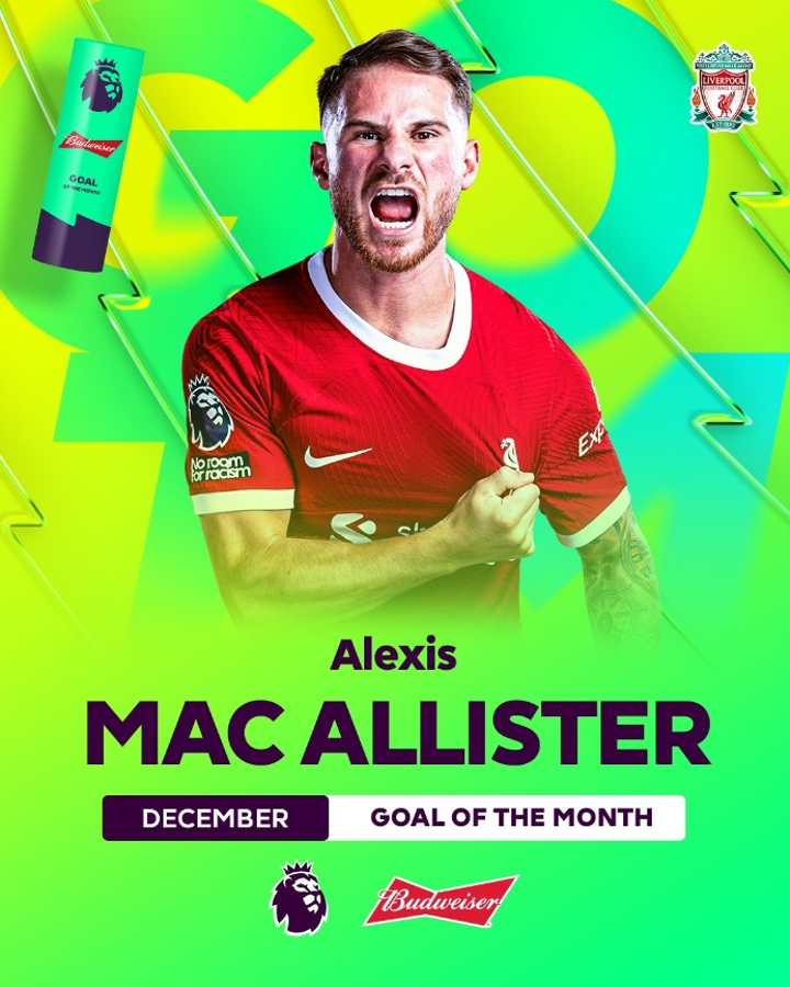 Alexis Mac Allister's incredible long-range strike in Liverpool's 4-3 win over Fulham has won December 2023's Budweiser Goal of the Month award.