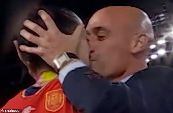 Also on the stage was Spanish Federation boss Luis Rubiales, who threw his arms around Hermoso, and gave her a strong hug while whispering in her ear. He then put both his hands on the back of her head head and kissed her on the mouth - with Rubiales now set to face a FIFA disciplinary investigation.