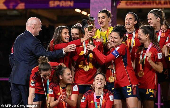 Hermoso and her teammates were congratulated by dignitaries including Queen Letizia, dressed all in red in support of her compatriots, who gave players a warm embrace.