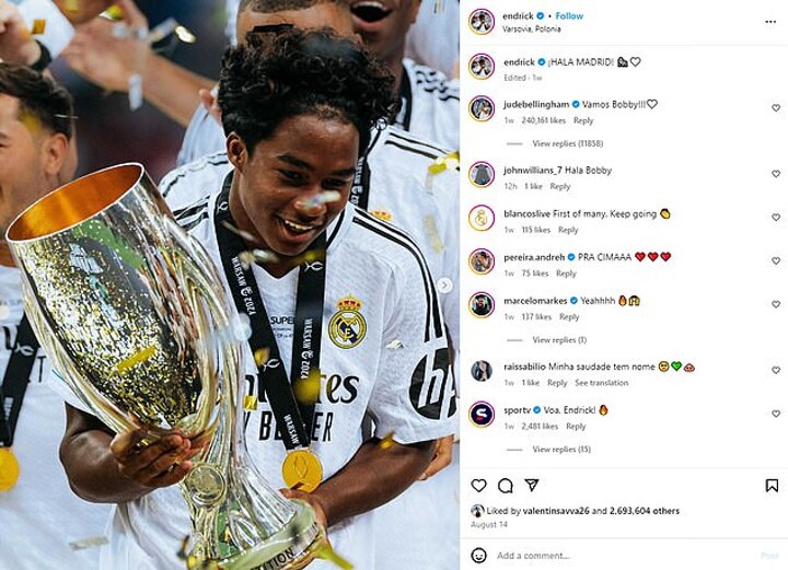 However, Endrick's debut game and goal for Madrid in LaLiga against Real Valladolid prompted several teammates to flood his Instagram and jokingly refer to him as 'Bobby'.
