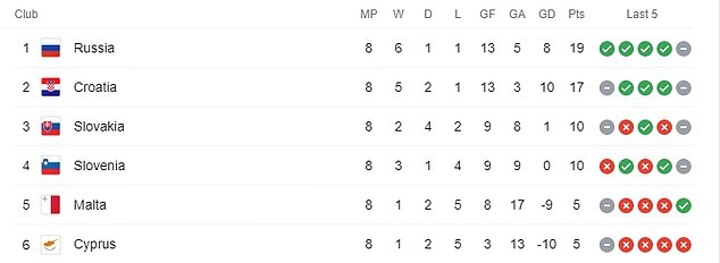 Croatia should overcome the challenge of Malta away, though it's less guaranteed. Assuming Russia win, Croatia must match their rival's result to stay alive in the race.