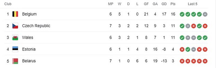 It's currently the Czech Republic who hold the position of runner-up, though they have played a game more than Wales in third.
