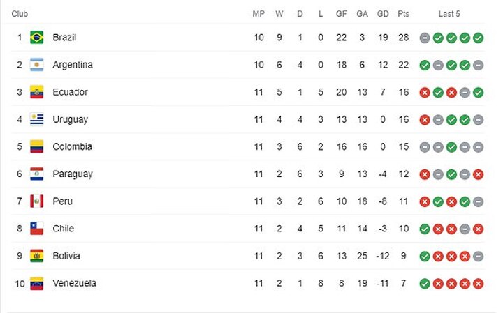 Argentina are six points clear of their closest rivals Ecuador, while Brazil are 12 points ahead.