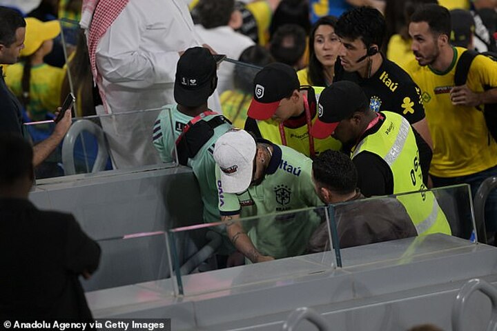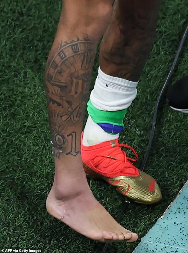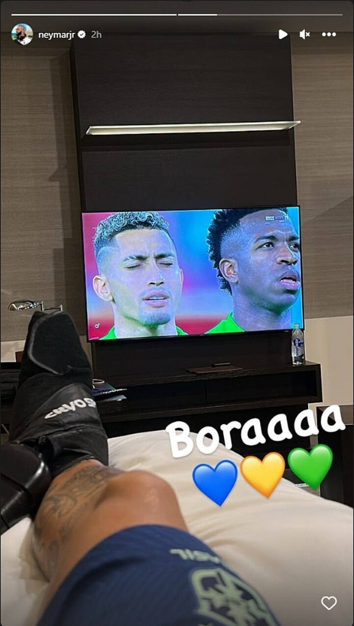 In fact, he wasn't anywhere near the Stadium 974 as he continues his recovery. He posted a photo to his Instagram story of his foot, wrapped in a compression boot, propped up on a bed with a television screen in the background showing his teammates singing the Brazilian national anthem before the game kicked off. He wrote, 'Boraaaa,' which translates to, 'Let's go.'