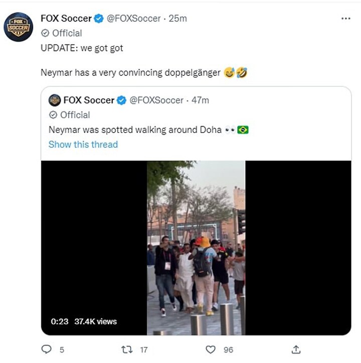 And in fairness to FOX, it saw the funny side. 'UPDATE: we got got,' it wrote. 'Neymar has a very convincing doppelganger' alongside some crying with laughter emojis.