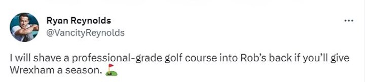 That's when Reynolds decided to join the conversation, as he replied to Bale's tweet by saying: 'I will shave a professional-grade golf course into Rob’s back if you’ll give Wrexham a season.'