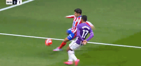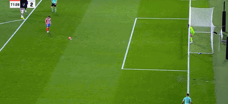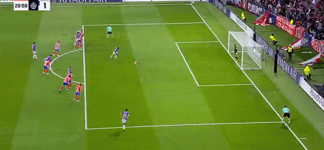 第27分钟,迅速反超,西蒙尼扣过防守球员小角度劲射得分,马竞2-1