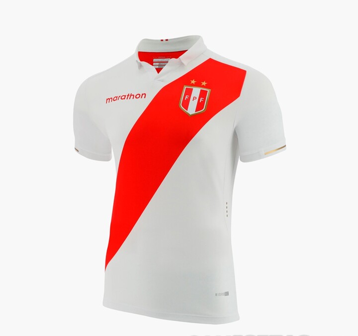 The new Peru shirt boasts a very traditional look that respects the iconic design of a white base with a red sash. It has a retro collar and adds gold as accent color to the white and red.