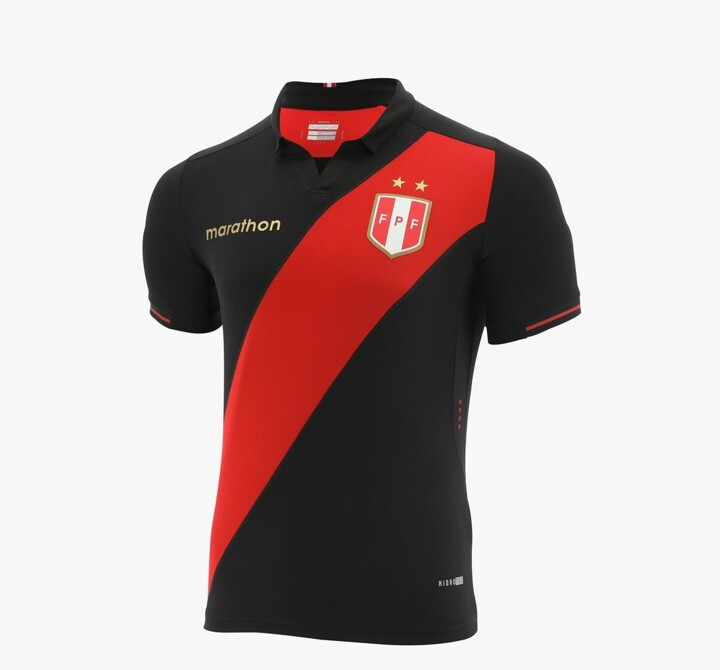 Based on the same design and template as the home shirt, the new Peru 2019 away kit is black with a red Sash and gold applications. On the back on the neck is the national flag, while the Peru Football Federation logo in gold is placed below the collar.