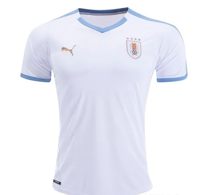 Based on the same template, the Uruguay 2019 Copa America away shirt is mainly white with sky blue accents on the sleeves, neck and cuffs. The Puma logos are gold on the Uruguay 2019 away jersey.