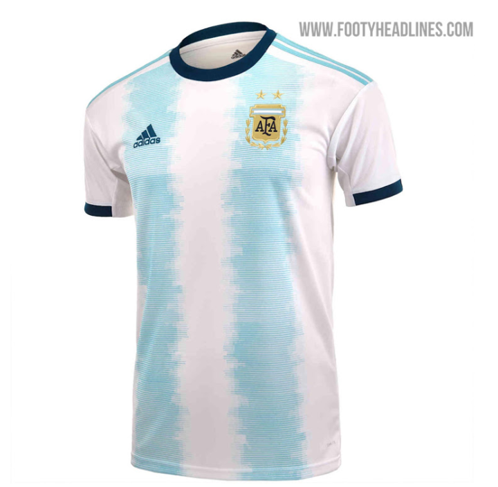Predominantly white, the Argentina 2019 Copa America jersey features just two sky blue stripes on the front and back, with a pretty unique brush stroke effect applied to them.
