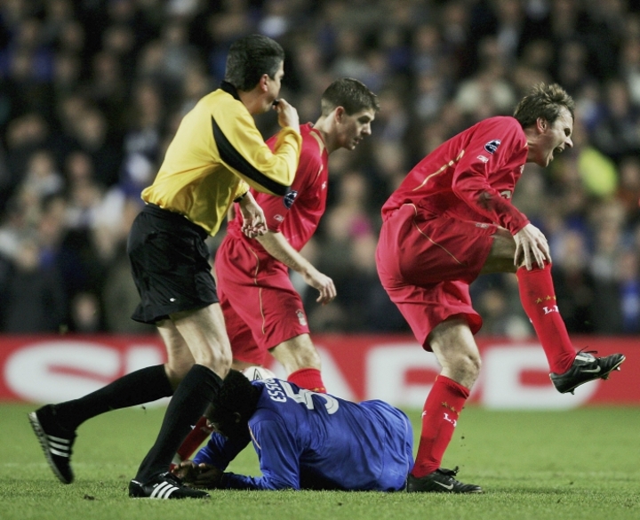In December 2005, during a Champions League group game with Liverpool, Essien went studs-up on Dietmar Hamman just below the knee in what one is contractually obliged to describe as a 'horror tackle'.