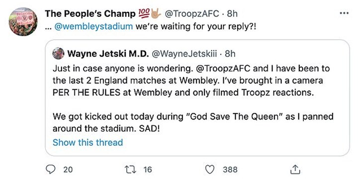 'I’ve brought in a camera PER THE RULES at Wembley and only filmed Troopz reactions. We got kicked out today during “God Save The Queen” as I panned around the stadium. SAD!