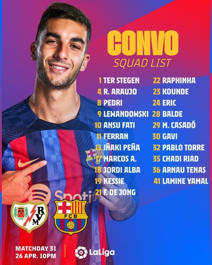 This is the Barça squad to face Rayo Vallecano in Vallecas: Ter Stegen, Iñaki Peña, Arnau Tenas; Araujo, Pedri, Lewandowski, Ansu Fati, Ferran Torres, Marcos Alonso, Jordi Alba, Kessie, Frenkie de Jong, Raphinha, Koundé, Eric Garcia, Gavi, Marc Casadó, Balde, Pablo Torre, Chadi Riad and Lamine Yamal.