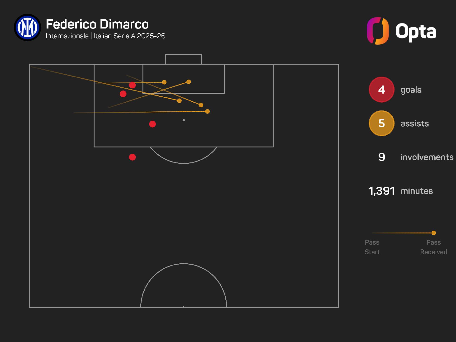 And, with four goals and five assists, the 28-year-old has been involved in nine Serie A goals this season, with no defender having a better record in Europe's top five leagues in 2025-26 (Alejandro Grimaldo also has nine).