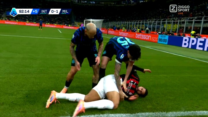 In the 3rd minute of stoppage time of this game, Milan midfielder Loftus-Cheek fell to the ground in the attacking third to protect the ball but was whistled for a foul. Subsequently, the English midfielder pinned the ball under his body, while Bastoni, forcefully tried to retrieve the ball, even making a grabbing move. Finally, with the intervention of the assistant referee, Inter Milan regained possession of the ball.