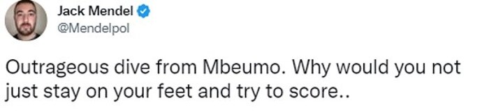 'Bryan Mbeumo trying to win an Oscar as he goes round Fraser Forster… What an utterly pathetic dive that is', one wrote.