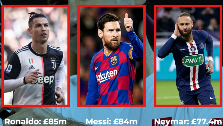 Football players Cristiano Ronaldo (£85.3m), Messi (£84.5m) and Neymar (£77.6m) and American basketball player LeBron James (£71.6m) rounded out the top five.