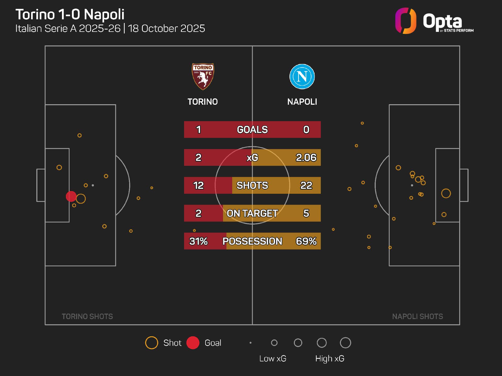 Napoli registered an expected goals (xG) total of 1.83 from their 22 shots, though only five were on target, compared to Torino's 1.97 from their 12 attempts in the contest.