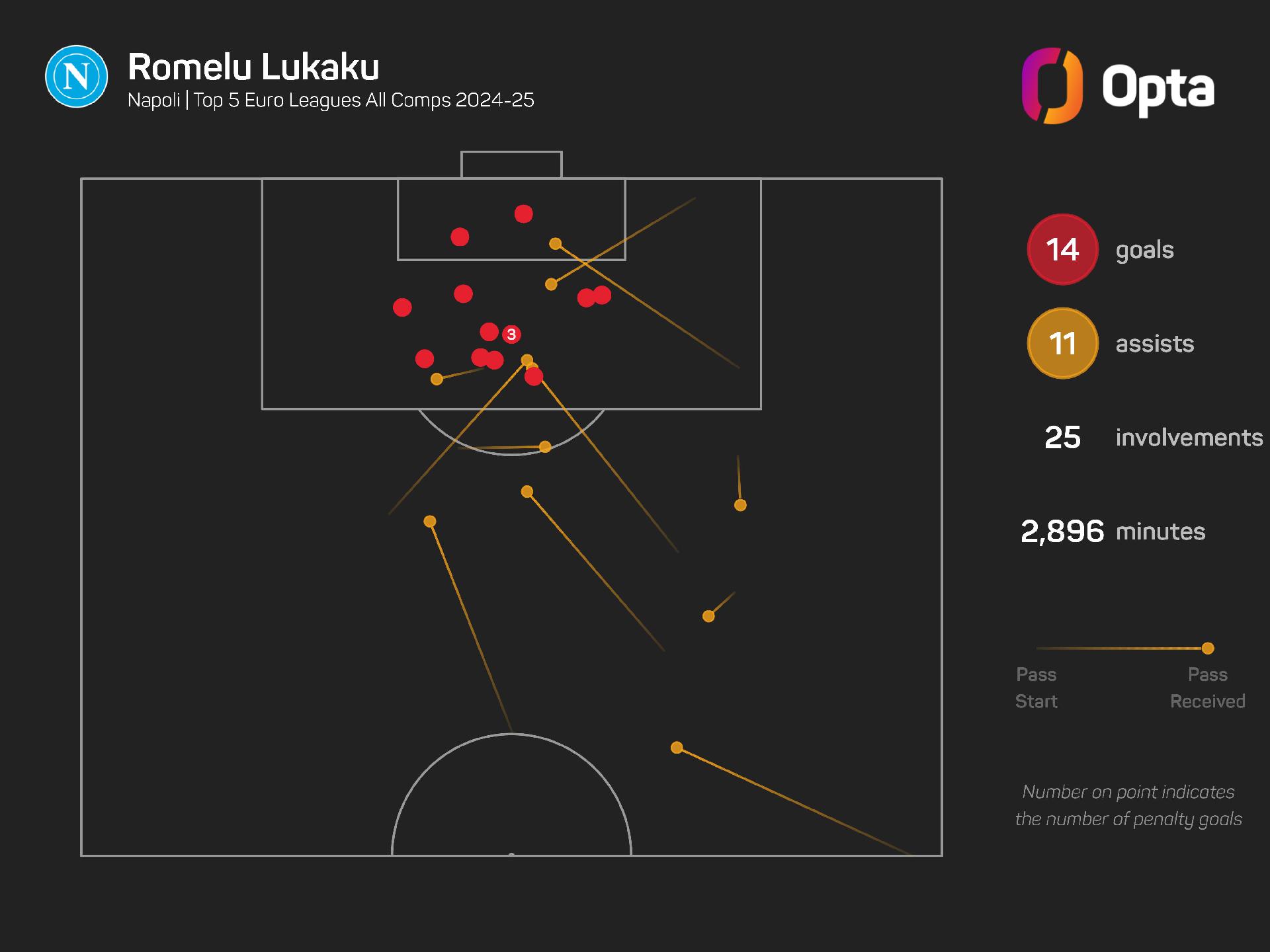 He led all Napoli players for goals (14), expected goals (13.2), assists (11) and total goal involvements (25), with that latter figure being at least eight more than any of his team-mates (Scott McTominay had 17).