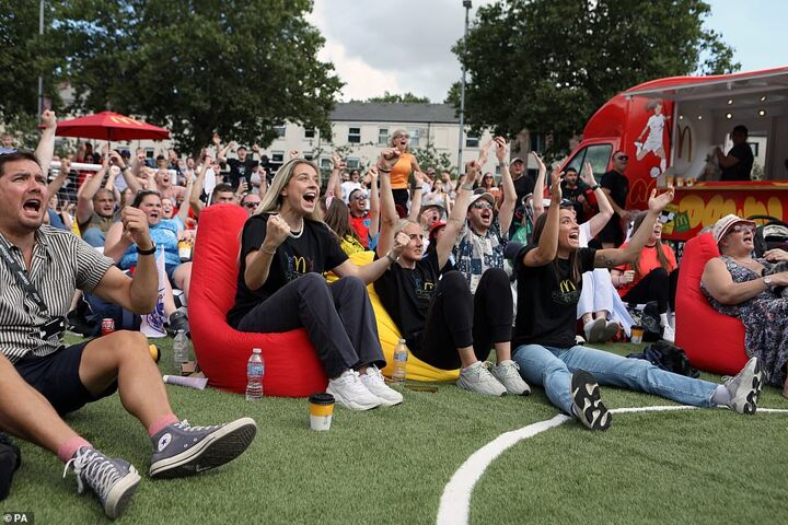 England fan parks - especially the Boxpark sites across London - had erupted after the Lionesses' first-half goal. Although the morning kick-off appeared to dampen the enthusiasm to send beers flying in the air following Toone's strike, one fan at BoxPark Croydon in South London was seen throwing his child in the air in delight.