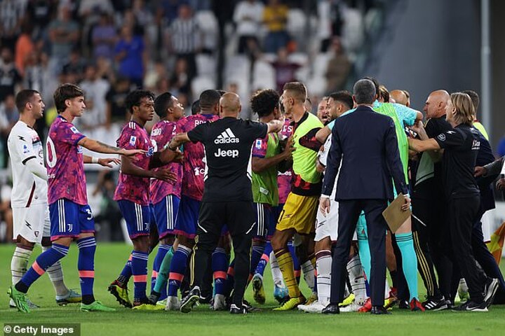 The intervention of VAR ruled out the Polish striker's goal but his red card stood, sparking almighty on-pitch brawl with two other players red carded along with Allegri.