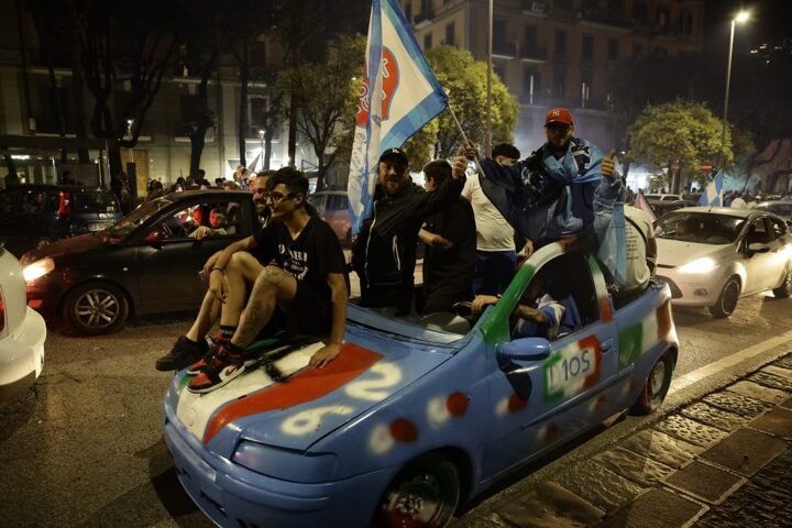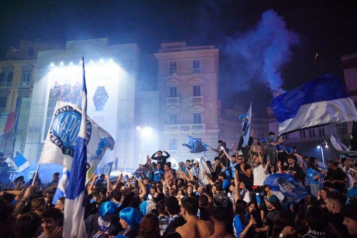 The Neapolitan party carried on long into the night as hundreds of banners with the number four were hung above the iconic narrow streets in the Quartieri Spagnoli neighbourhood.