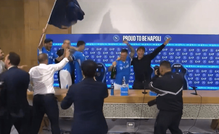 But the Napoli squad gatecrashed the interview and soaked him in champagne.