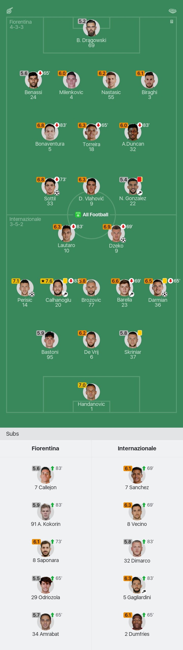 We bring you the player ratings for Fiorentina vs Internazionale as Calhanoglu becomes Man of the Match with a rating of 7.6.