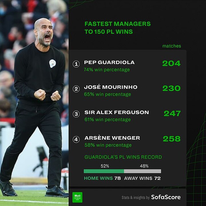 To put that into context, Jose Mourinho required 230 matches to reach 150 wins, Sir Alex Ferguson needed 247 and Arsene Wenger 258. Guardiola has blown these legendary managers out the water.
