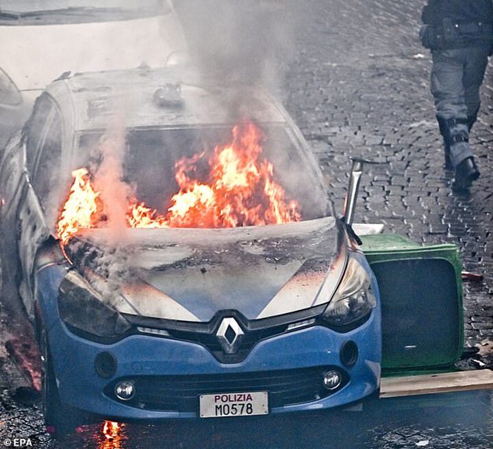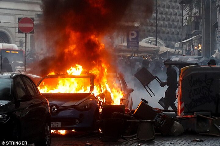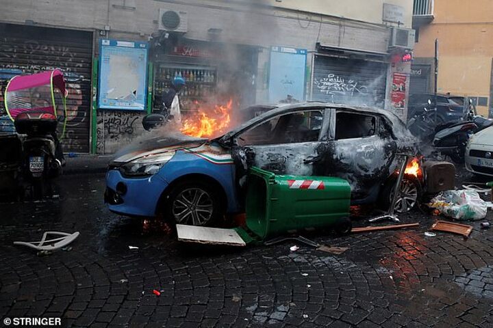 Cars, including a police vehicle, were set ablaze, projectiles were thrown, and windows were smashed in by fans. Now their behaviour has been praised by the Napoli chief who admitted he is 'proud' of their thuggish behaviour.